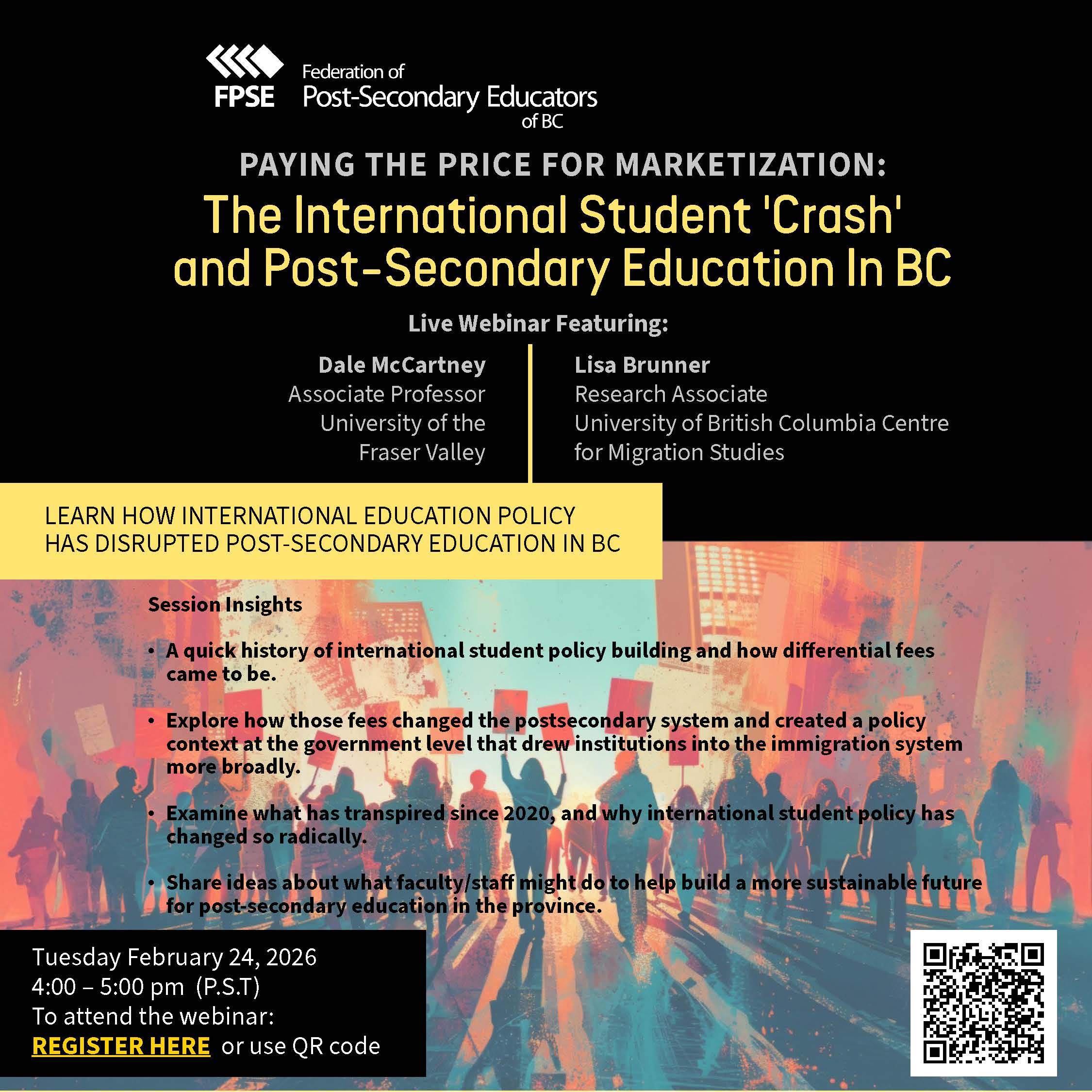 The Federation of Post-Secondary Educators of BC (FPSE) is hosting a short one-hour webinar on “Paying the Price for Marketization: The international student ‘crash’ and post-secondary education in BC” with […]
