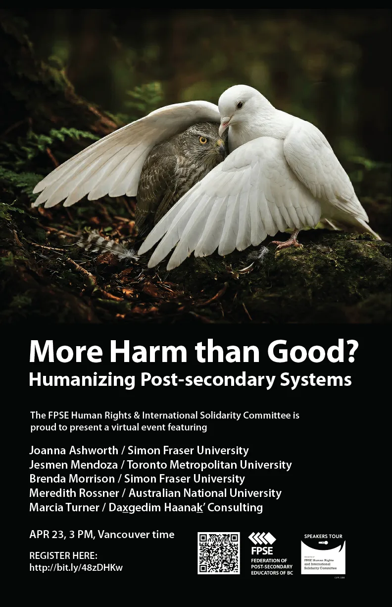 This year FPSE’s Human Rights Speakers’ Tour webinar takes “Humanizing Post-Secondary Systems” as its theme. Central to the discussion is the question as to how and why so many institutional dispute resolution processes end up causing more harm than good, often inflicting lasting damage to individuals, even when processes are resolved in their favour. To investigate this phenomena, speakers with backgrounds in restorative justice, institutional psychology, and Indigenous governance will offer their insights and explore alternatives to current practices.